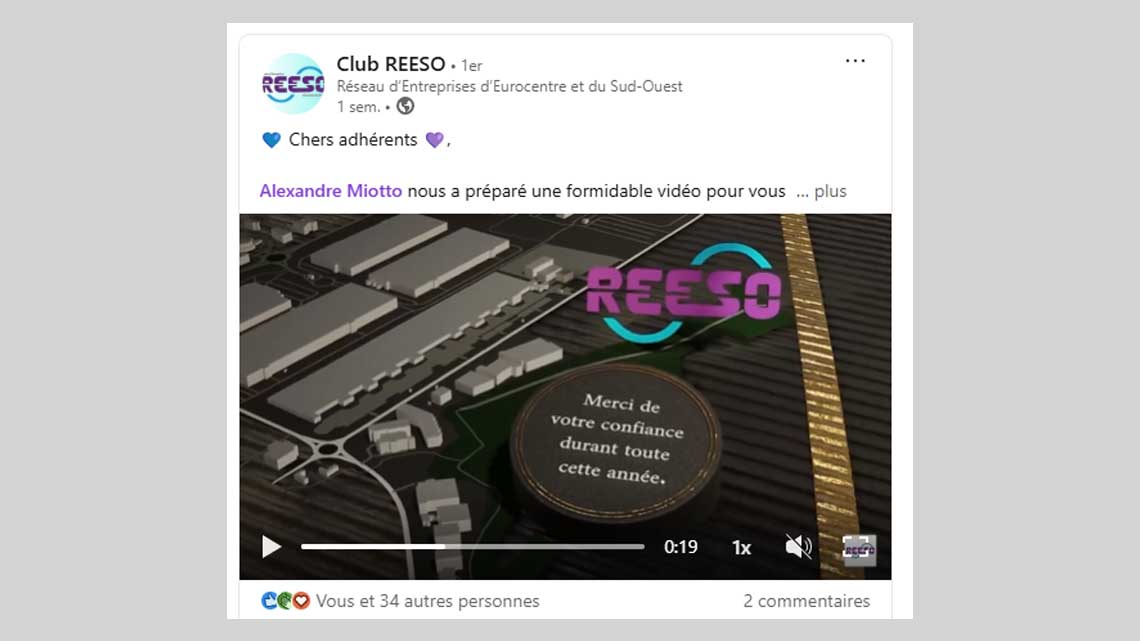 La vidéo a été personnalisée avec les valeurs du club "dynamisme" et “Convivialité”. Une représentation en 3D de l’eurocentre a été faite sur mesure à côté du logo Reeso.